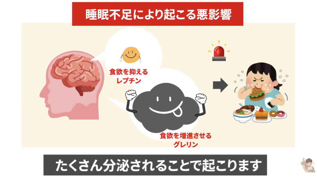 睡眠不足に陥ると、食欲を抑えるレプチンが減り、逆に食欲を増進させるグレリンが大量に分泌されます。