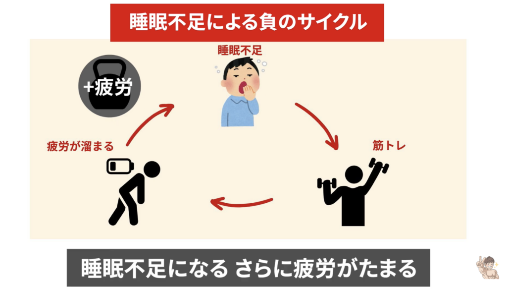 筋トレを行う▶︎疲労が溜まる▶︎睡眠不足になる▶︎疲労が抜けず、さらに筋肉が分解される▶︎次の筋トレで力が出せない▶︎筋肉が維持できない