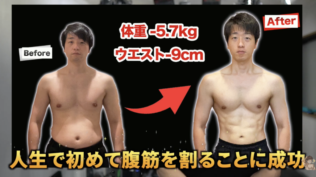 僕のコーチング受講生は、ダイエットで挫折を繰り返していた状態から、たった3ヶ月で体重-5.7kg、ウエスト-9kgで人生で初めて腹筋を割ることに成功しています。