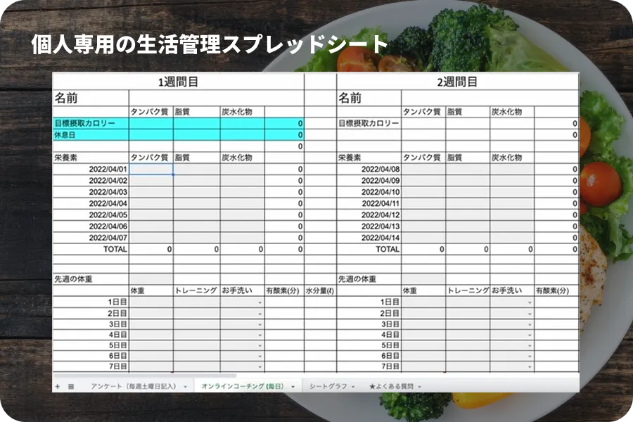 期間中は定期報告をお願いしており、その都度、質疑応答・改善点のアドバイスをさせていただます。結果はもちろん、終了後もご自身で体型を維持できる知識が身に付きます。