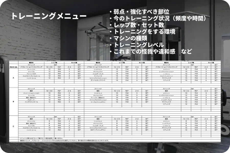 毎週のコンディションを見て、骨格・通っているジムの環境に合わせた専用のトレーニングメニューを作成・最適化します。当コーチングでは基本的に有酸素運動は行いません。