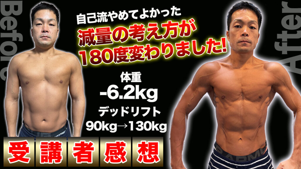 筋肉が落ちて、トレーニングも重く感じるようになり、そんな中で、かいとさんのオンライン指導を受け始めてから、食事・トレーニング・タイミングを指導していただき、減量中でも筋肉を維持しつつ絞る戦略を教えてもらえました。